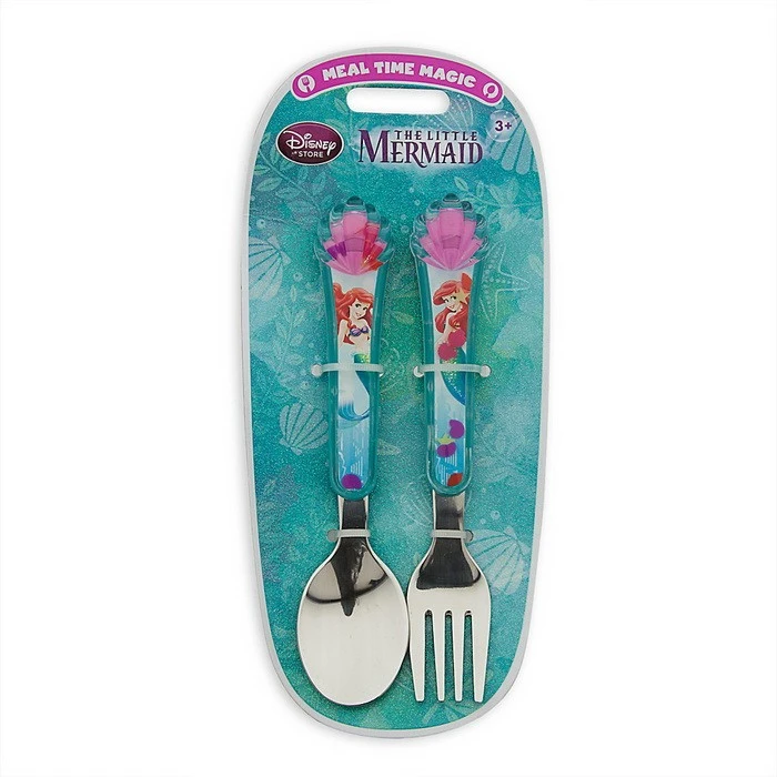 Ajoutez une touche de magie à votre table avec notre magnifique ensemble de couverts à l’effigie d’Ariel ! La fourchette et la cuillère en acier inoxydable possèdent un manche à double paroi contenant des étoiles de mer et des coquillages flottants.