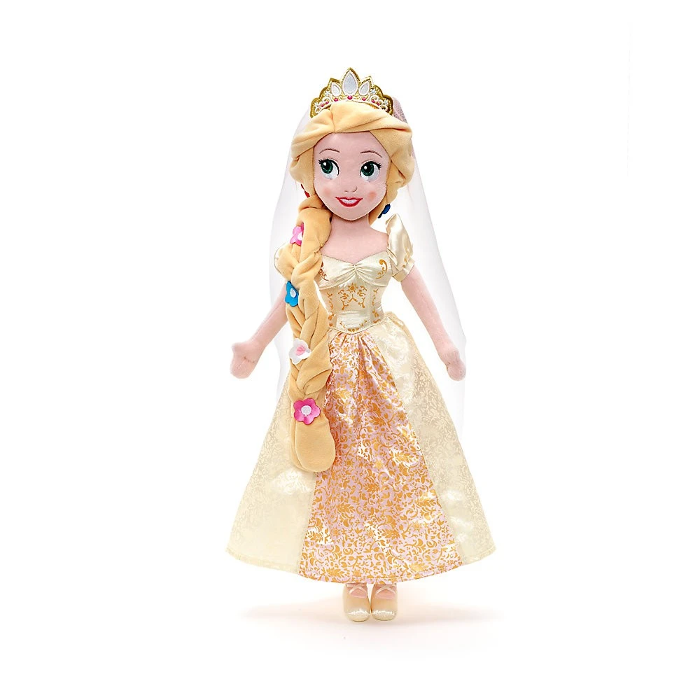 vus pouvez maintenant ramener chez vus cette ravissante peluche de Raiponce avec sa robe de mariée et sa couronne. Elle porte une robe en satin dorée avec un corsage à motifs et sa longue chevelure, bien entendu.